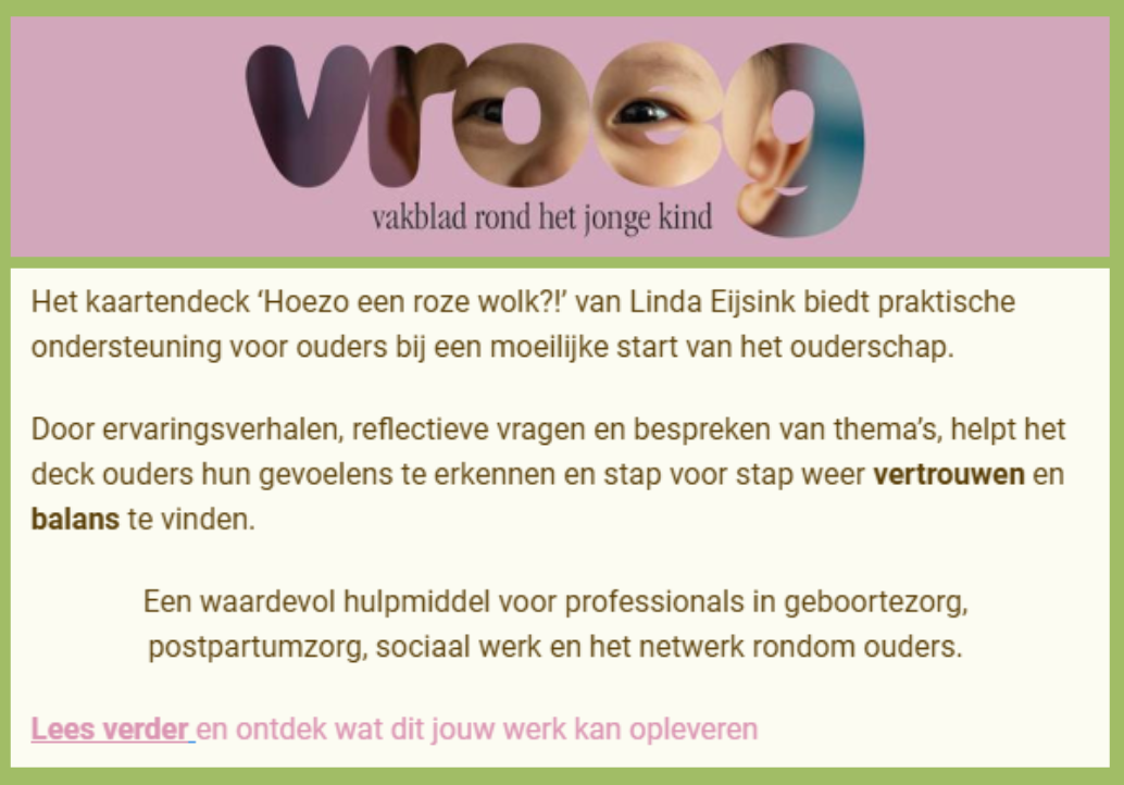 ‘Deze kaarten kunnen ouders helpen om dichter bij zichzelf te komen. De kaarten tonen respect en mildheid; en dat is fijn. Ook de twee kaarten m.b.t. de Postpartum Depressie (PPD) zijn uitnodigend en geven (h)erkenning. Prachtig product. Ik kan het kaartendeck van harte aanbevelen. Van belang voor de professionals in de geboortezorg en het sociaal werk, voor vaders en moeders die de roze wolk hebben zien veranderen in een grijs of donkergrauw dreigend wolkendek, voor de eerstelijnszorg, voor het omringende steunsysteem (familie, vrienden, collega’s, mantelzorgers).
